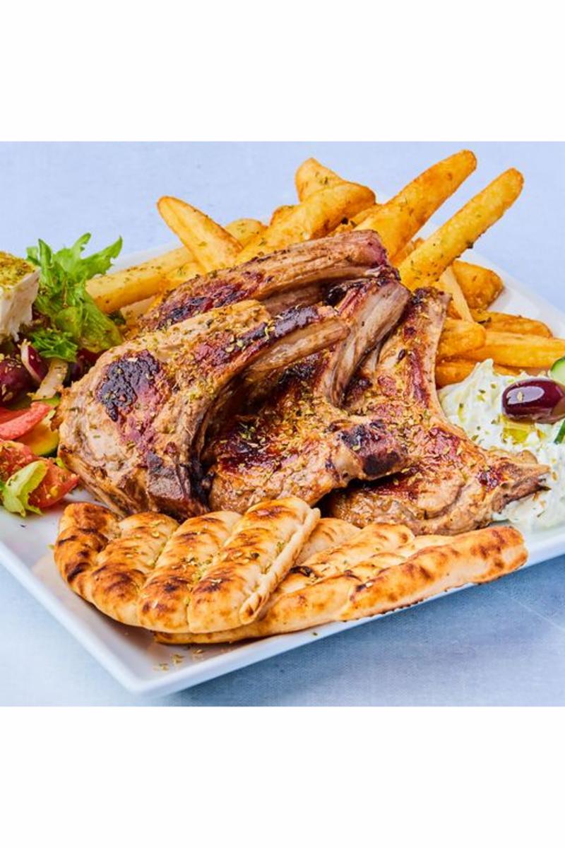 4 stk. grillede lammekoteletter som på Kreta, med mynte og hvitløksmarinade. Serveres med gresk salat, pitabrød, tzatziki og pommes. Allegener: Hvetemel, melk