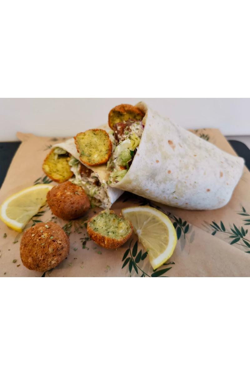 FalafelRull med salat, løk, tomat, agurk, tatziki og pommes