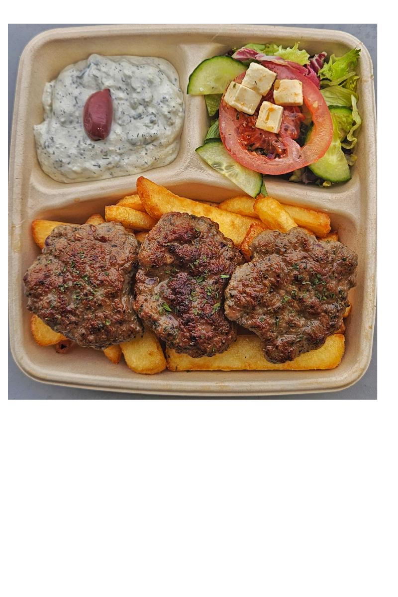 Keftedes ( Greske kjøttkaker, gresksalat, tatziki, Pita og pommes)