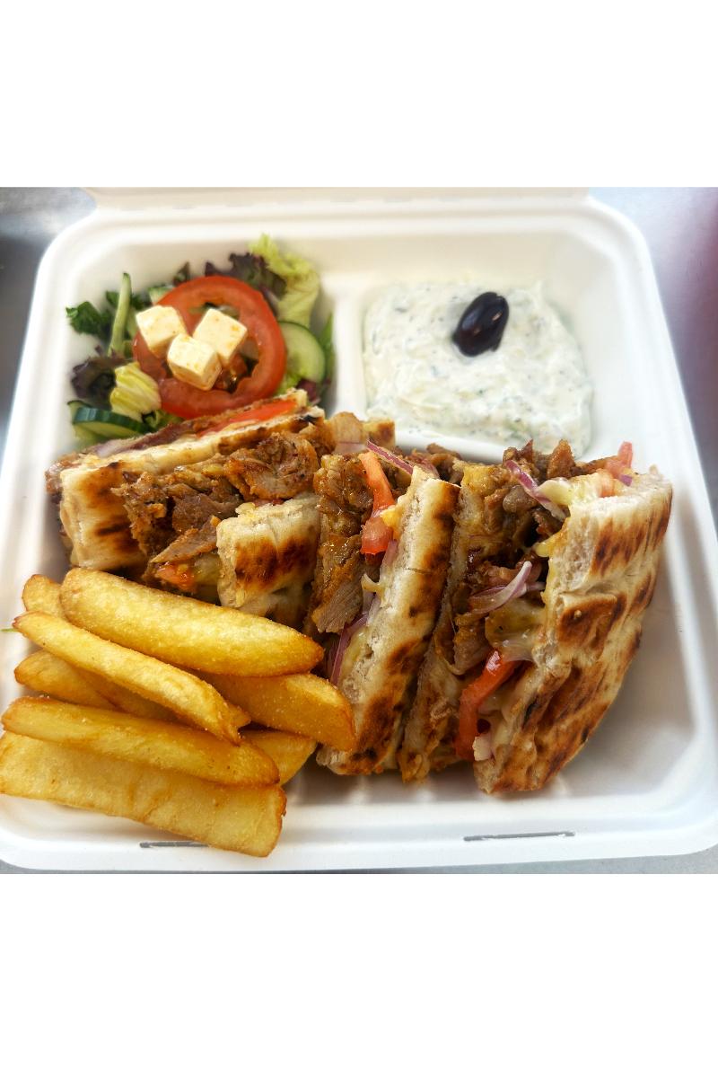 to grillede pita en på toppen og bunnen som sandwich fylt med ost, tomat, løk, gyros kjøtt svin/kylling
