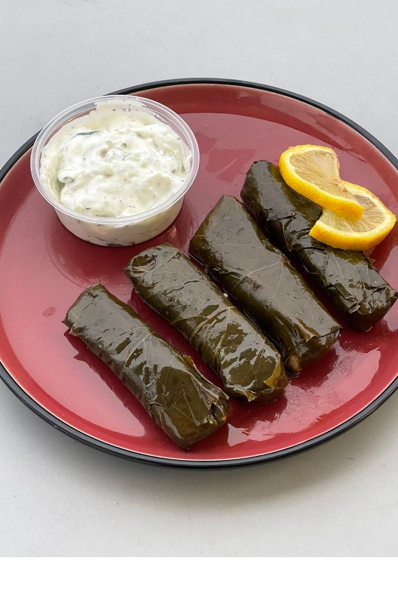 Vinblader, ris, løk, olje, tomatpure, mynte, persille, salt og pepper, sitron, Serveres med Tatziki